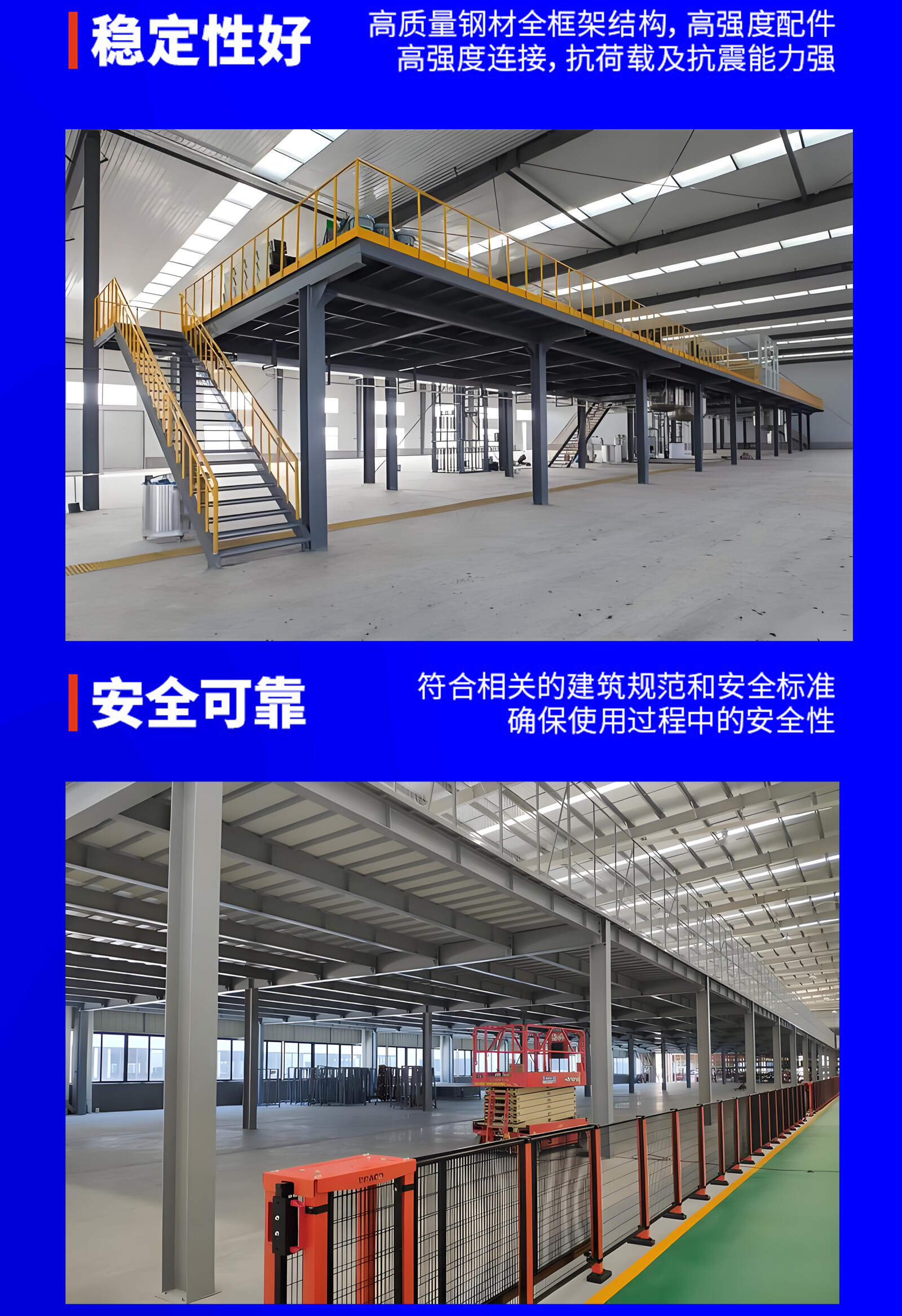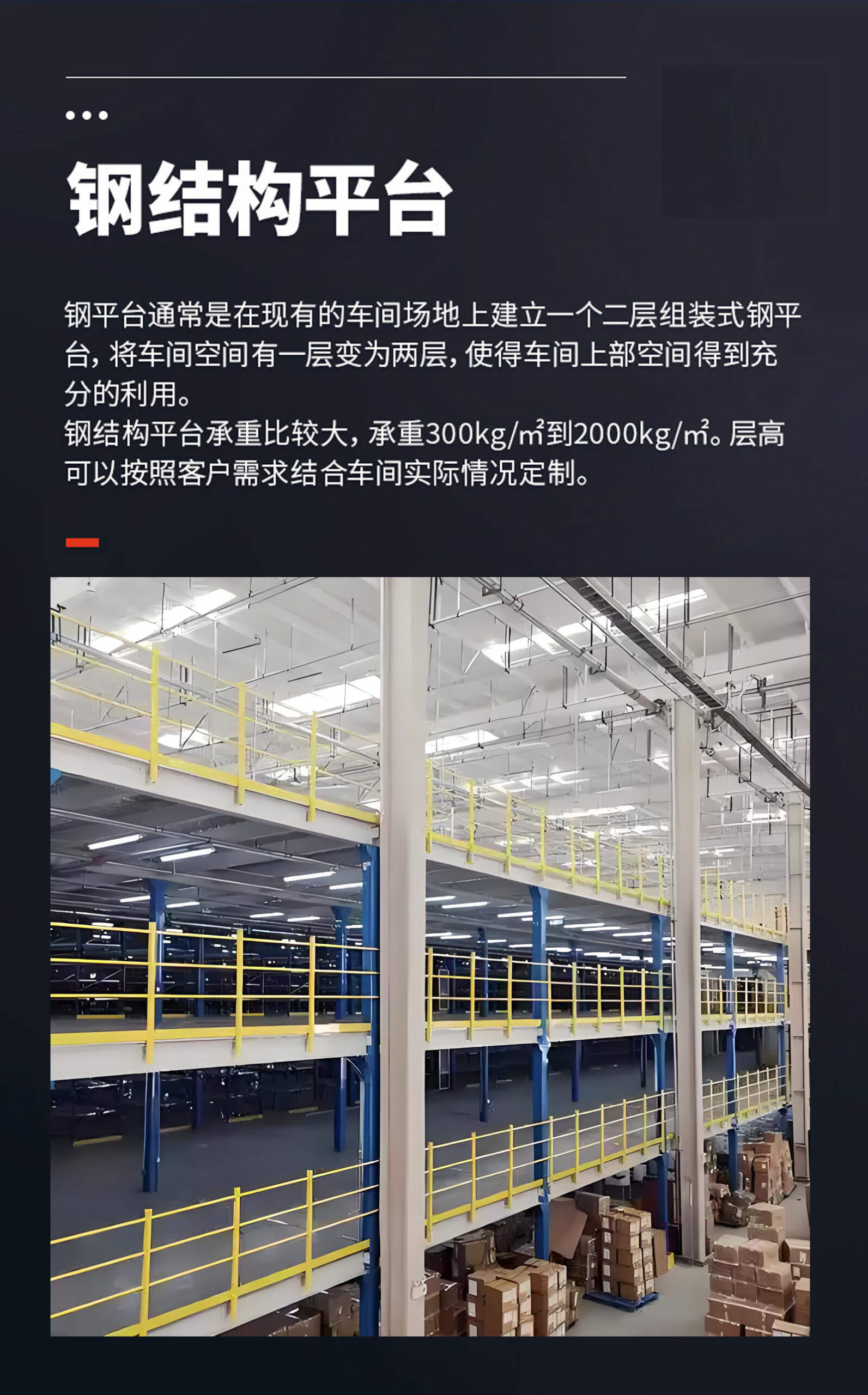 A steel platform is typically constructed as a two-story prefabricated steel platform on an existing workshop site, increasing the workshop space from one floor to two, making full use of the upper workshop space. Steel structure platforms have a high load-bearing capacity, ranging from 300kg/m² to 2000kg/m².