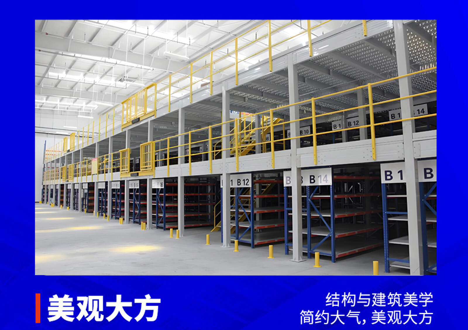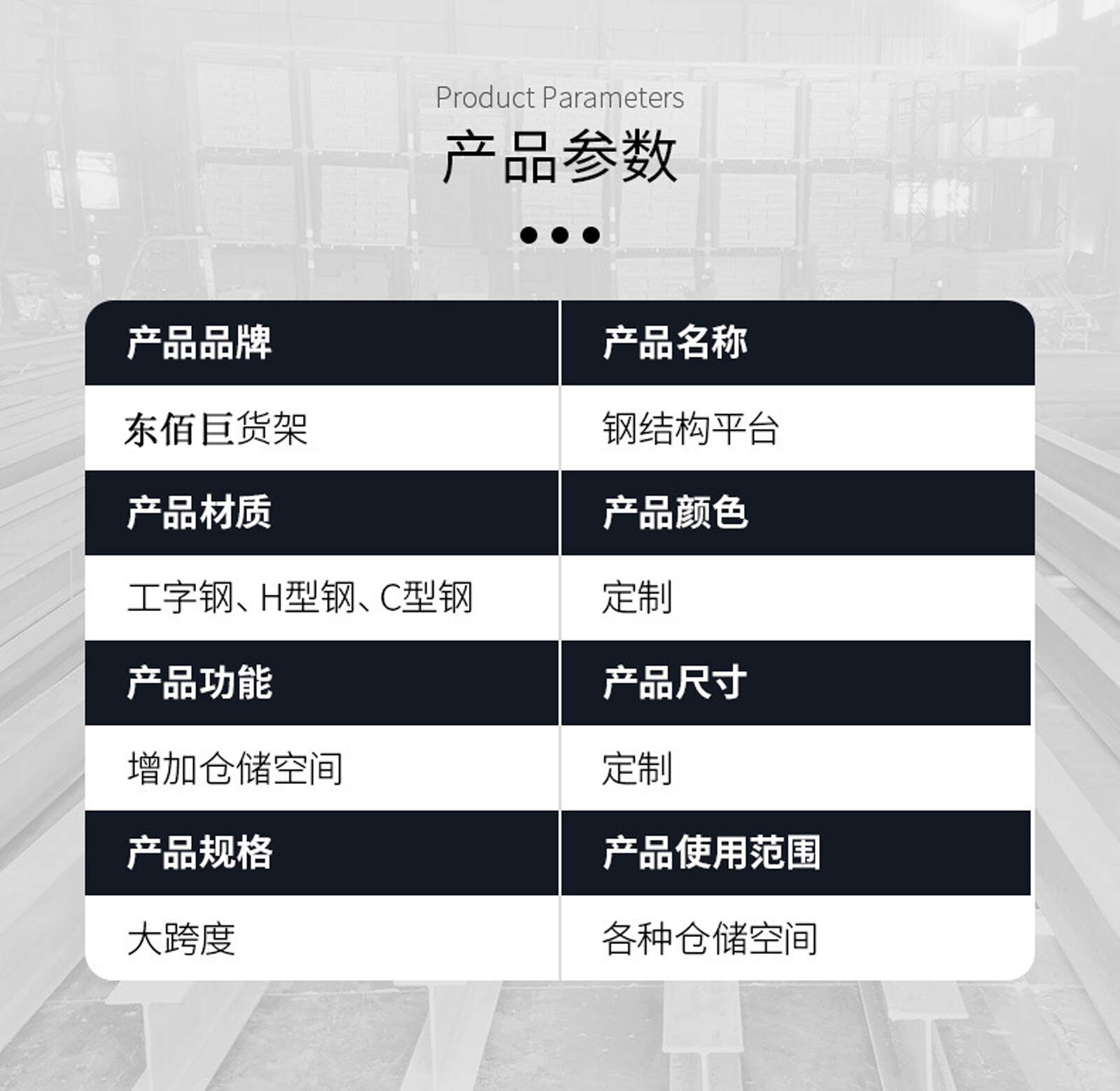Product parameters: Dongbai giant loft shelves, steel structure platform, I-beam, H-beam, C-beam, can be customized according to customer needs to increase storage space and suitable for use in various warehouses.
